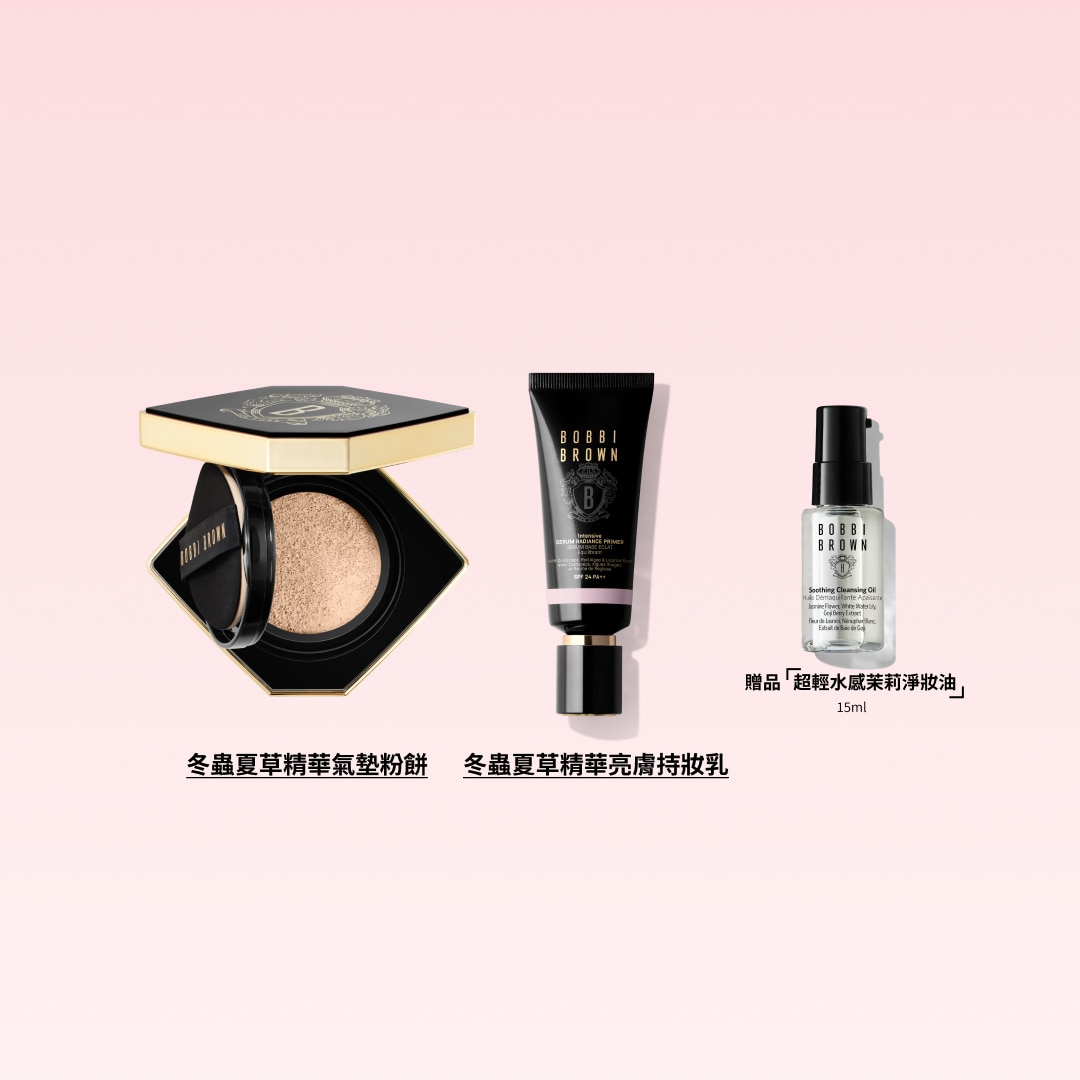 冬蟲夏草精華亮膚持妝乳、冬蟲夏草精華氣墊粉餅 + 贈品: 超輕水感茉莉淨妝油 15ml